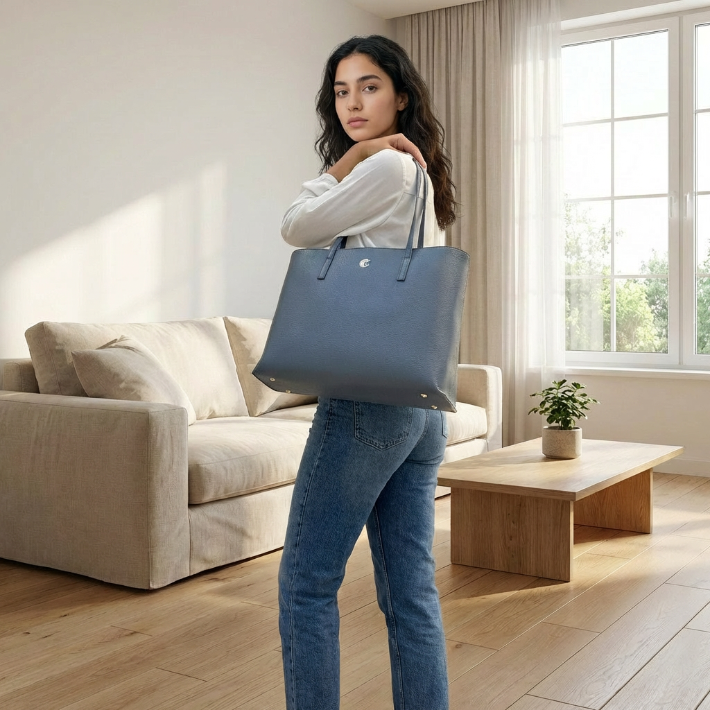 Our new "Alma" tote bag is a true essential. Light & roomy, it is the prefect trendy accessory to carry around everything you need. It is large enough to carry your laptops & files or even to serve as an overnight bag. They are made of carefully chosen pebbled grain vegan leather (PU). The signature plate is a slightly oversized and domed version of the iconic "C" logo, signed with a Cacharel engraving. The inside is roomy, yet organized with a small zipped compartment.
