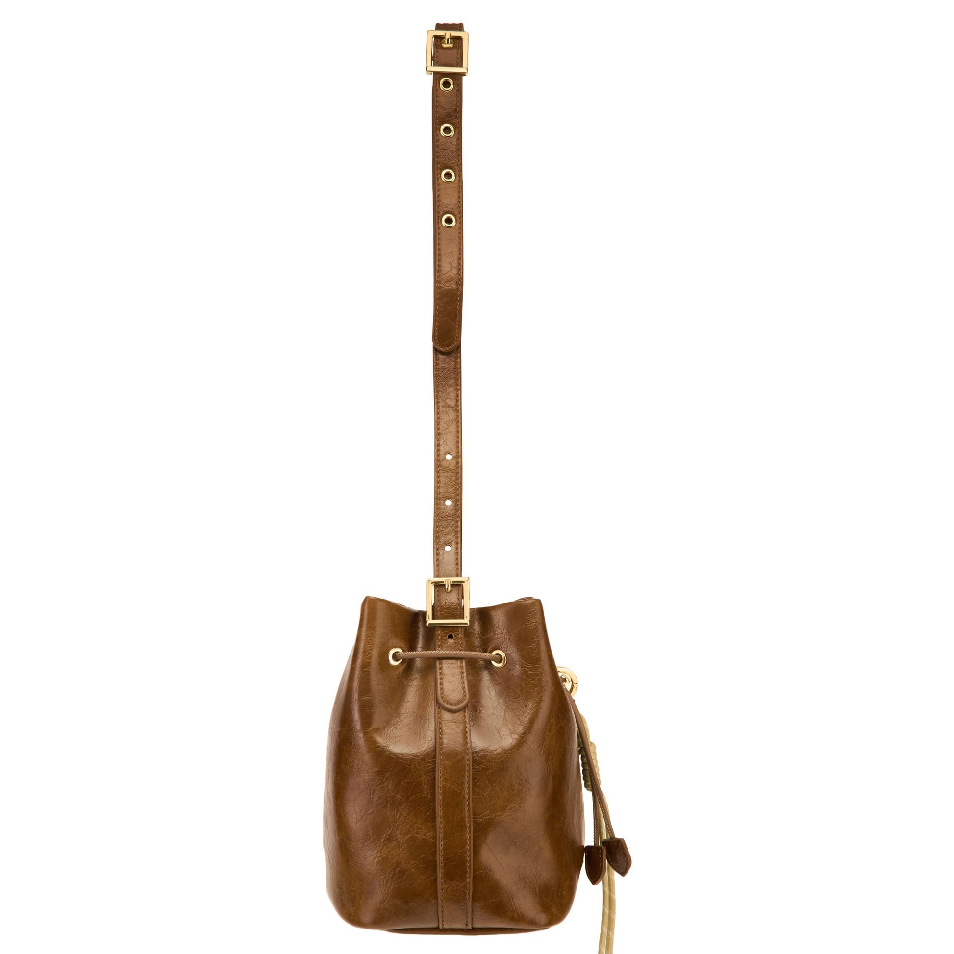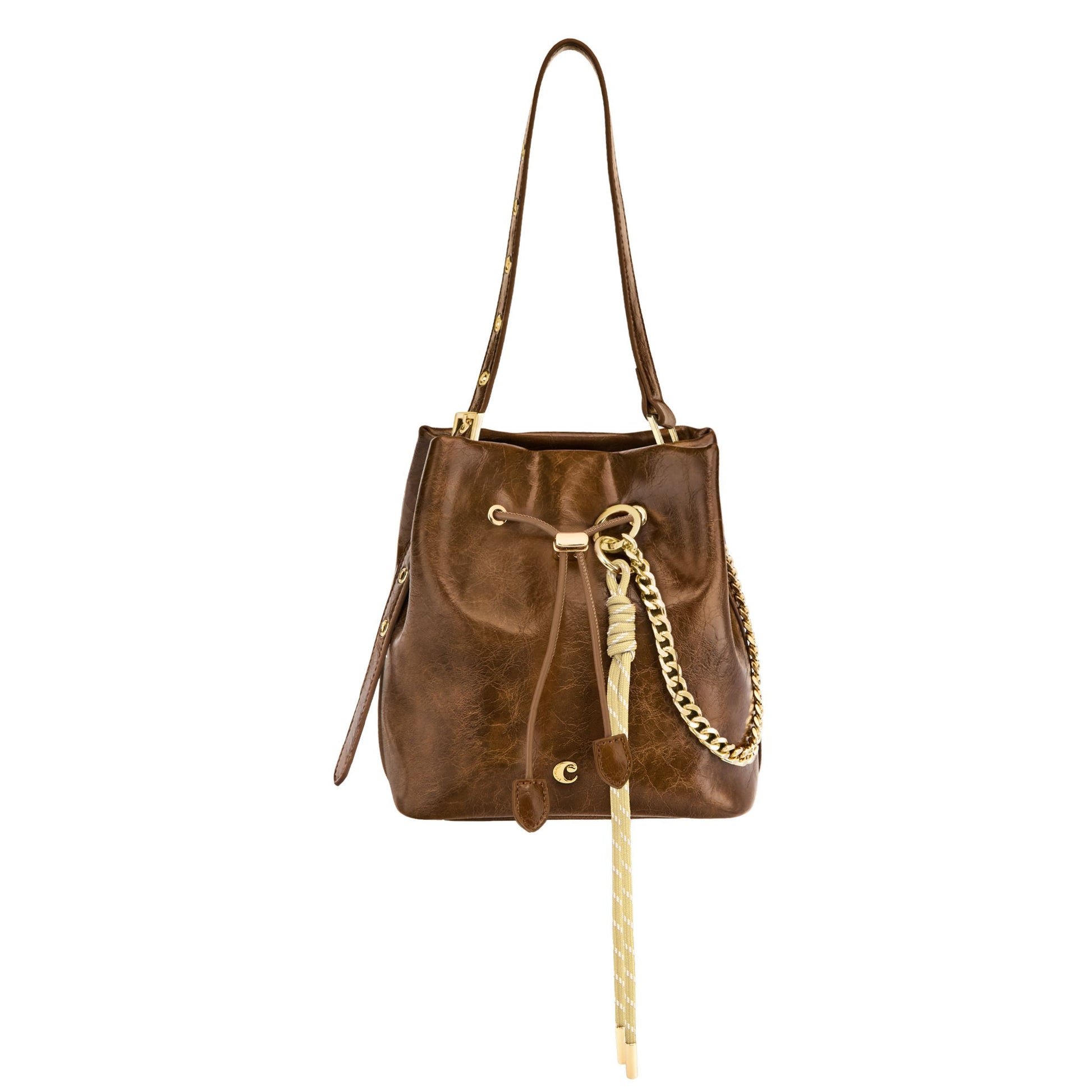 The Philomene bucket bag blends timeless elegance with a bold, fashion-forward attitude. Crafted from a glazed, crinkled leather-like texture, it is signed with the signature Cacharel C plate, enhanced by refined gold trims, and finished with a discreet embossed Cacharel logo. The material is soft, supple, and remarkably luxurious to the touch. Its adjustable strap allows for both hand and shoulder carrying, while an additional strap transforms it into a crossbody bag. A PU cord closure reinforces its pouch-like shape, and a removable decorative cord-and-chain charm adds a distinctive, stylish accent. Compact yet spacious, its interior offers ample room for essentials and includes a zipped pocket for added convenience. Available in black, burgundy, and camel.
